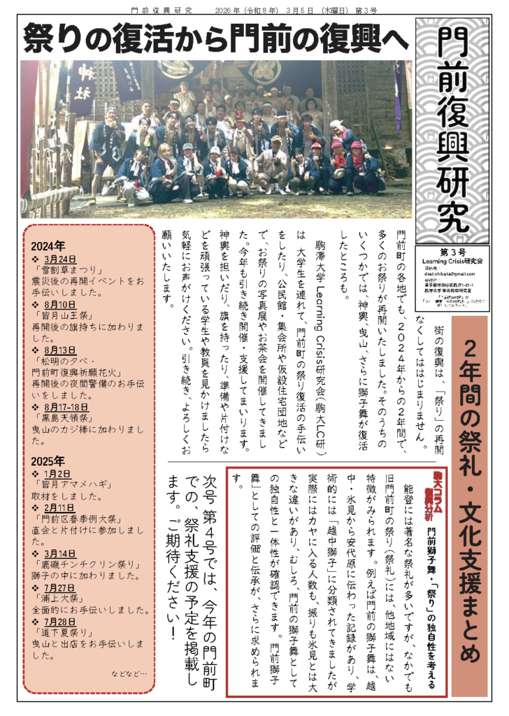 最新号 2024.03.242026.03.16 2026年3月20日(金)「門前復興研究」第4号が発刊されました! PDF版はこちらからダウンロードいただけます。 2026年3月5日(木)「門前復興研究」第3号が発刊されました! PDF版はこちらからダウンロードいただけます。 2024年4月6日(土)「門前復興研究」第2号が発刊されました! PDF版はこちらからダウンロードいただけます。