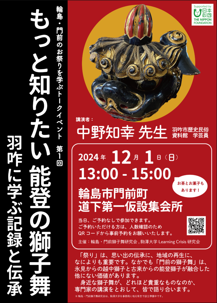 なお、チラシはもちろん、安代原のカシラです!本講演会は輪島市教育委員会のご後援で開催いたします。ご関係の皆様に深謝いたします。